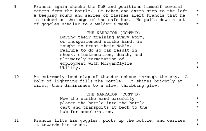 Nikola Tesla once said, “More than 35 years ago, I undertook the production of these phenomena (of lightning) and, in 1899 I actually succeeded, using a generator of 2,000 horsepower, in obtaining discharges of 18,000,000 volts carrying currents of 1,200 amperes, which were of such power as to be audible at a distance of 13 miles. I also learned how to produce such lightnings as occur in Nature, and mastered all the technical difficulties in this connection. But I found that even in the small and comparatively negligible trigger work called for the employment of thousands of horsepower; and this is the great obstacle now in the way of this supreme accomplishment.” Lightning In the Bottle asks what if that obstacle were removed? Funded by a series of barons, including J.P. Morgan, Tesla’s Wardenclyffe tower became the staple of wireless energy for the world and sadly the cause for “The Great War.” Soon after the war, Tesla’s concept of free energy existed for only a brief time before a process was found to capitalize on the wireless energy. A systematic procedure and workforce was created to capture lightning into containment units (similar to oversized Leyden Jars). These measurable units became known as bottles and the persons responsible for their capture became known as Strikehands. Utilizing technology based on designs of both Tesla and his understudy, Thomas Edison, MorganClyffe Utility built an energy empire, but at the price of a peaceful society. A caste system, based on corporate hierarchy, was born. Lightning In The Bottle is a satirical docu-narrative that chronicles the life of the Strikehand and in particular a third generation one named Francis Benson. On a routine visit from the Vice Chancellor of Propaganda and Development, Francis acting upon instinct, saves the VC of P&D’s life. He is rewarded with a raise, thus allowing him to climb up the rungs of the caste. He can now work on the 59th floor.